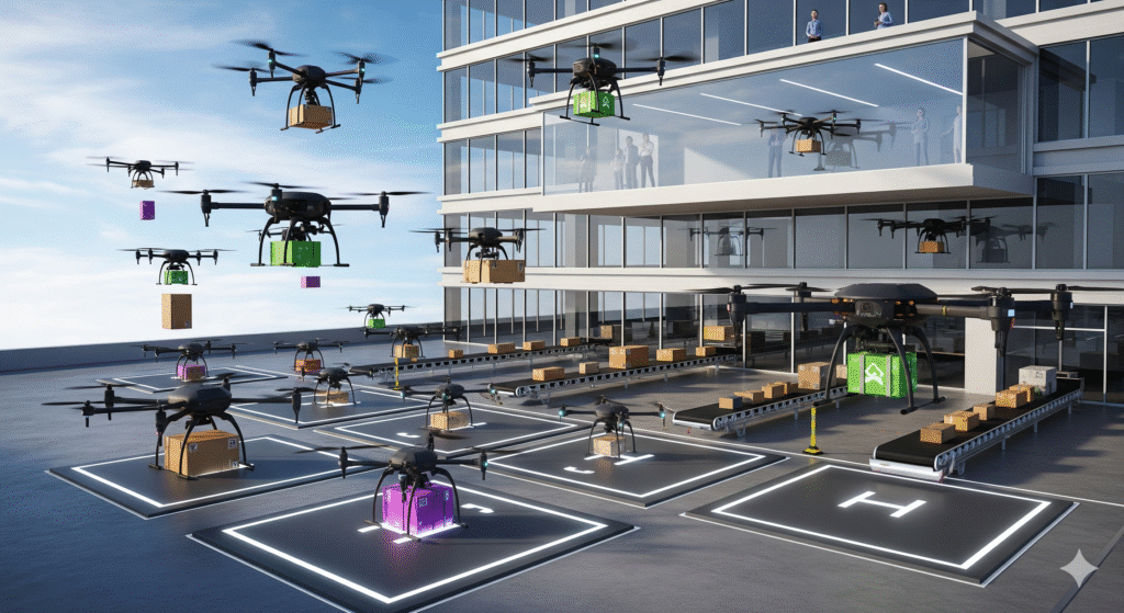 • E-commerce and Groceries (The Urban Trials): In cities like Gurugram and Bengaluru, startups like Skye Air are testing grocery and package deliveries from warehouses directly to residential complexes, beating the city traffic.